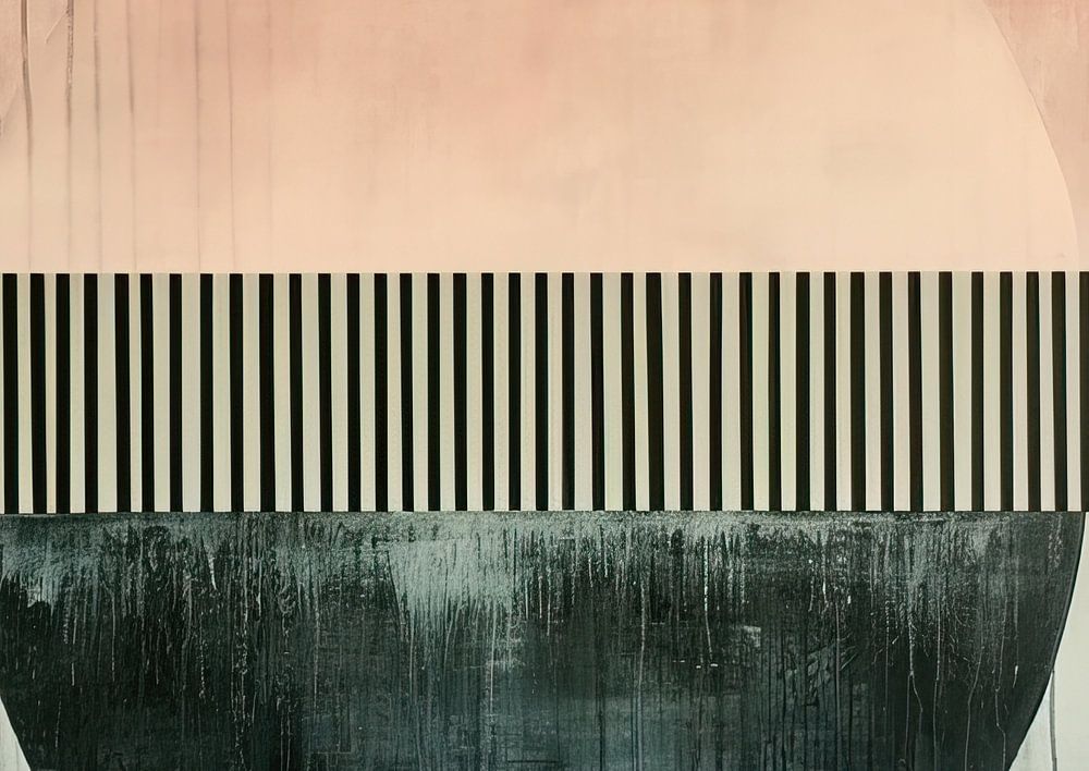 Abstract Circle Art | Pink Industrial Circle - This painting plays with visual contrasts, an upper part with a soft pinkish background and vertical brushstrokes, combined with a central large circle split in two by a sleek black and white striped bar. The lower part of the circle flows into a dark grey with brushstrokes dripping down, giving it a raw and industrial feel. It is an intriguing mix of softness and structural rigour.
