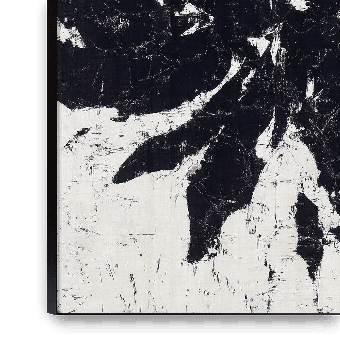 A raw, expressive depiction of a large flower in black ink or paint on a white canvas. The "distressed" effect includes scratches and splatters, giving the bloom a weathered, organic appearance.