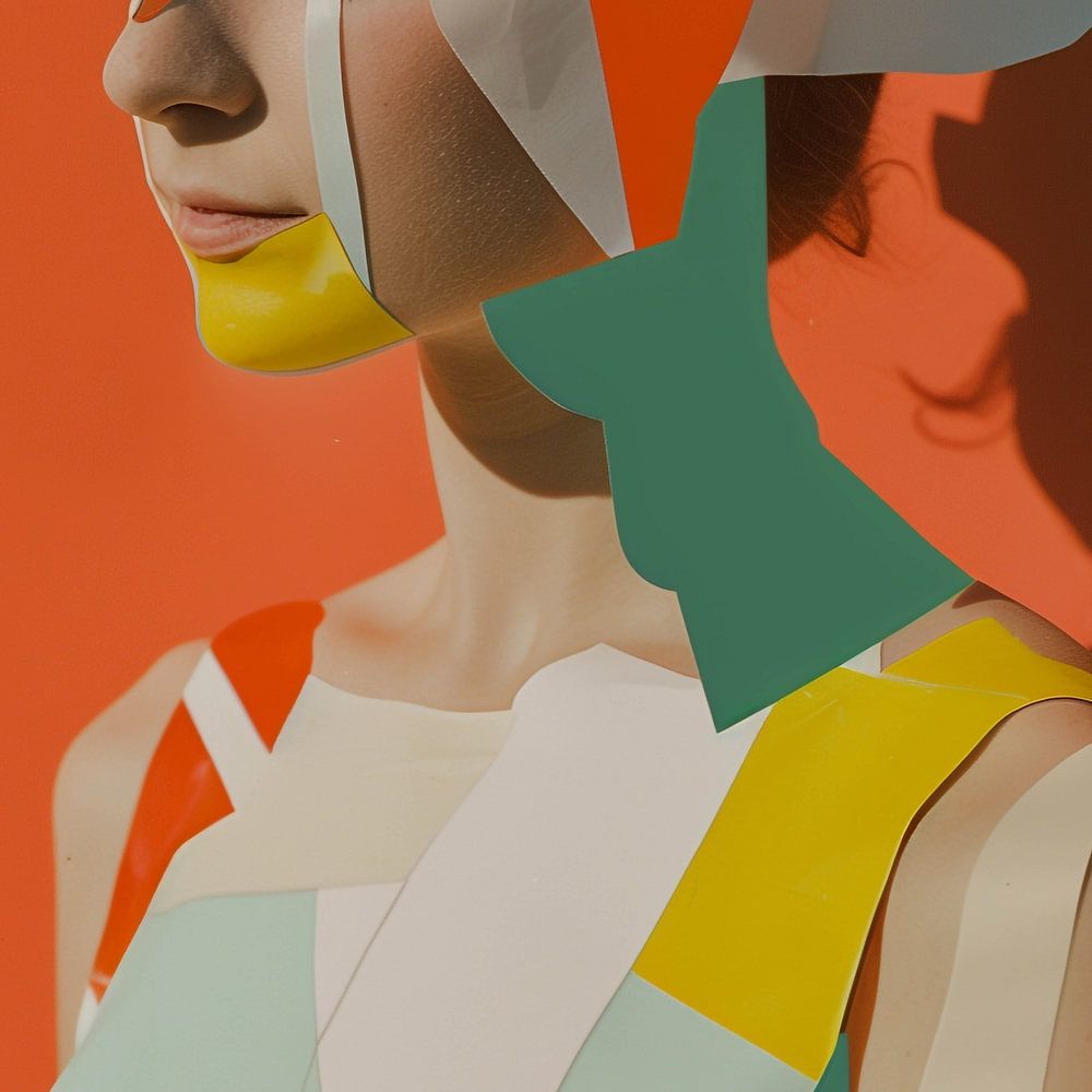 Intriguing portrait of a woman depicted partly in profile, with an emphasis on geometric shapes and contrasting colours. The figure appears to be layered, as it were, with a shadow of itself creating the illusion of depth and movement. The artist uses a mix of orange, yellow and soft pastel shades that blend harmoniously and exude a warm atmosphere. The clear lines and shapes suggest an abstract representation of fashion or style, with the woman almost seeming to merge into the background, both enhancing and blurring her presence.