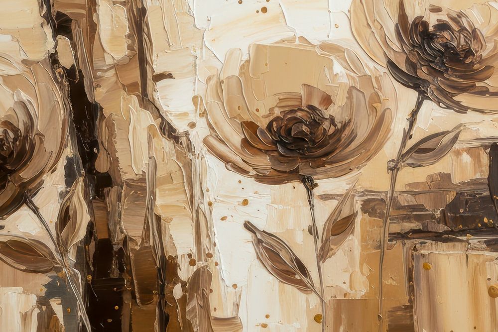 A sophisticated abstract oil painting in which three elegant flowers light up against a warm background of beige, taupe and deep brown tones.