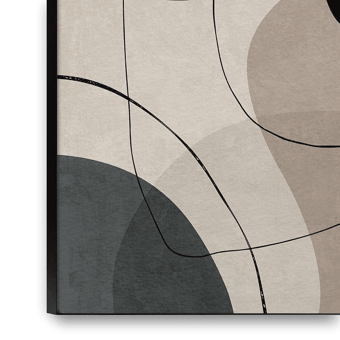 Abstract geometric, organic shapes and lines on a background with earthy brown, beige and dark grey colors.