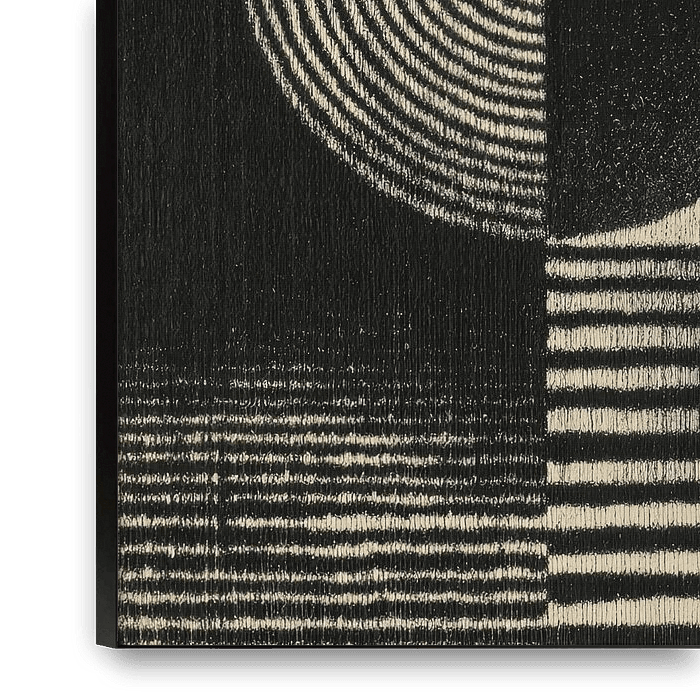A fascinating black-and-white composition that combines geometric shapes and patterns. A central element shows half of a circle with concentric lines, while the other half is a dark filled semicircle. The background is divided into four quadrants, dominated by textures such as fine vertical lines, dark grain and horizontal stripes. The…