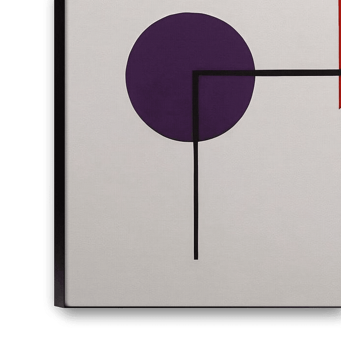 This vibrant artwork is a play of shapes and colours, where harmony and contrast go hand in hand. The simple geometric shapes, consisting of circles and rectangles, are brought together in a carefully composed space of bright and bold colours. The clean lines and planes of unsaturated hues create a minimalist yet powerful image that both stimulates the imagination and offers tranquillity. This piece would be a striking addition to a modern, stylishly decorated space, where it can capture the eye and invite reflection. Perfect for in an office where creative thinking is valued, or as a focal point in a minimalist-designed living room.