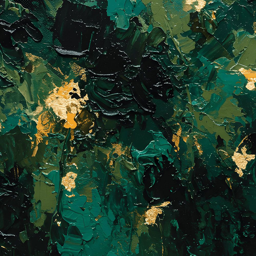 A vibrant abstract painting featuring rich emerald green hues and shimmering gold leaf accents, creating a luxurious and sophisticated visual texture. The artwork showcases a modern impressionist style with visible brushstrokes and a dynamic composition.