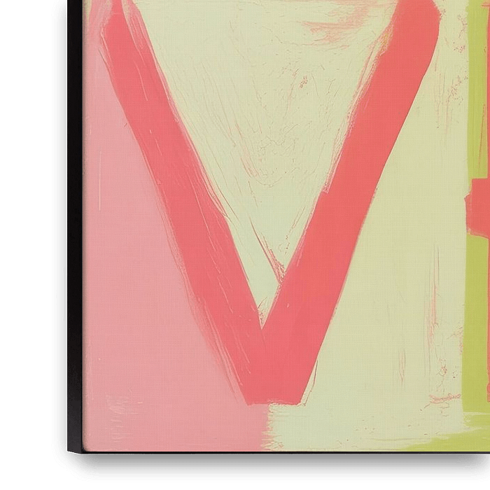 This abstract composition combines striking geometric shapes with a vibrant colour palette. At its centre is a large, delicate pink circle with a clearly visible brush texture. Beneath it, the word "LOVE" is arranged in bold red letters, with the letters offset and partially overlapping. The background flows smoothly into a light…