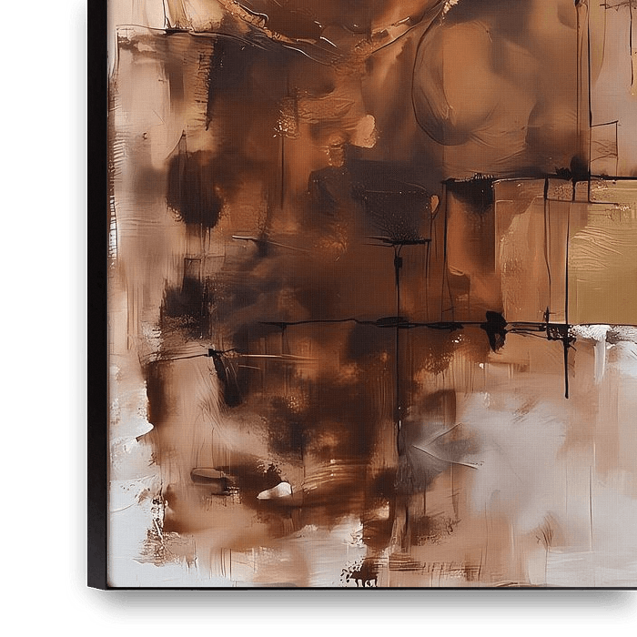 This abstract painting combines oil and acrylic paint with powerful touches of black ink and white chalk. Organic, elusive figures move through the image without fully revealing themselves. Warm brown and gold tones dominate, giving the work an earthy, almost sacred feel. The layering of materials creates depth and palpable texture.…