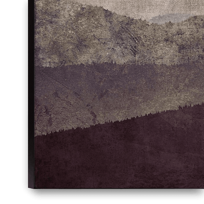 Layered hills or mountains recede into the distance under a textured sky. An earthy color palette of muted greens, browns, and whites gives the rustic piece a calm, yet aged appearance.