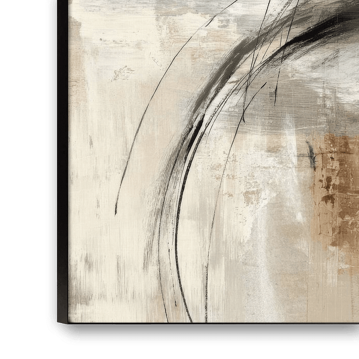 A serene abstract painting in beige, taupe and light grey, combined with soft chalky textured surfaces and an elegant curved black brushstroke that gives the work a sophisticated dynamism. The natural colours and calm composition create a Japandi sense of stillness and balance, as if lime, clay and wood textures were subtly blending…