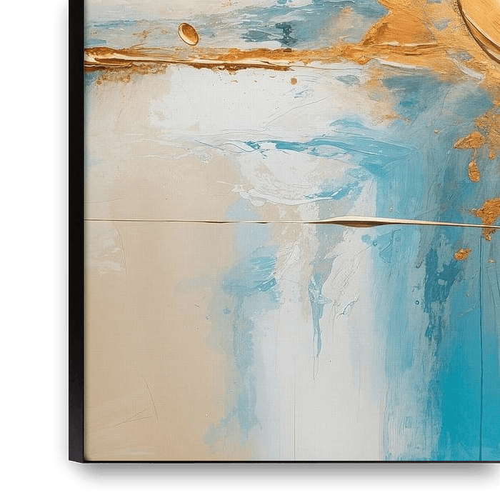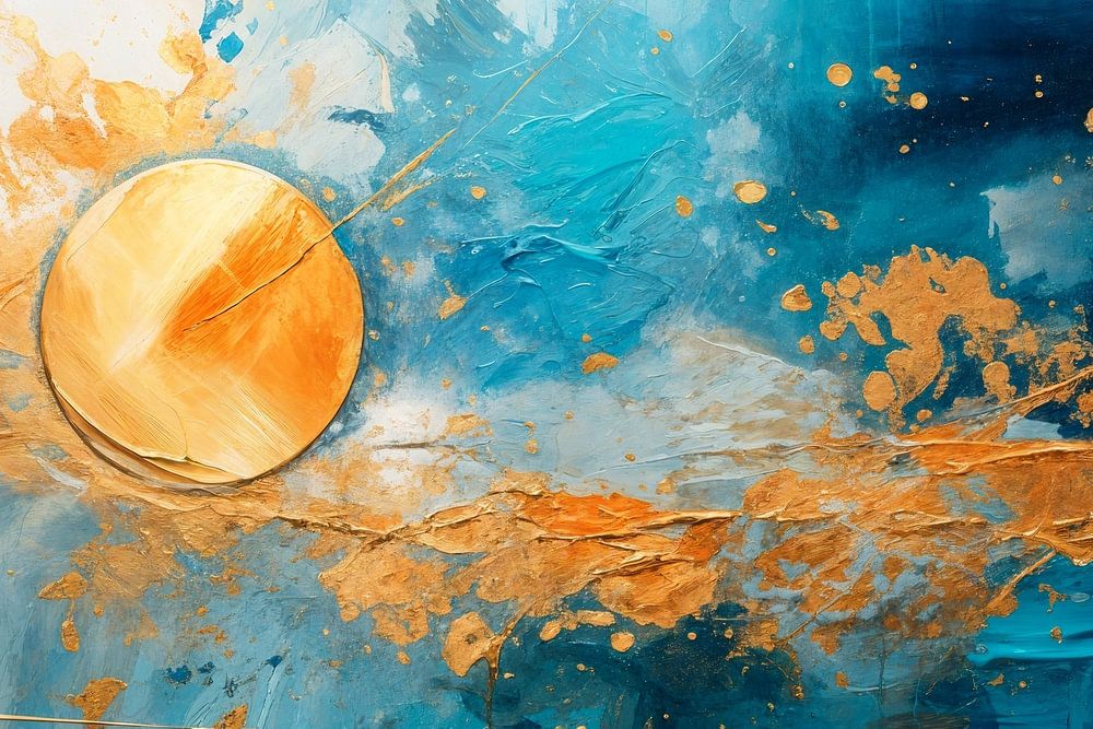 This blue-gold abstract painting with a radiant circle and refined texture feels powerful and mysterious, as if sun and sky merge in a single, energetic movement. The warm gold accents contrast elegantly with the deep blue tones, giving the work a luxurious appearance. It complements Modern Chic, Design, Japandi, and Grandeur Chic…