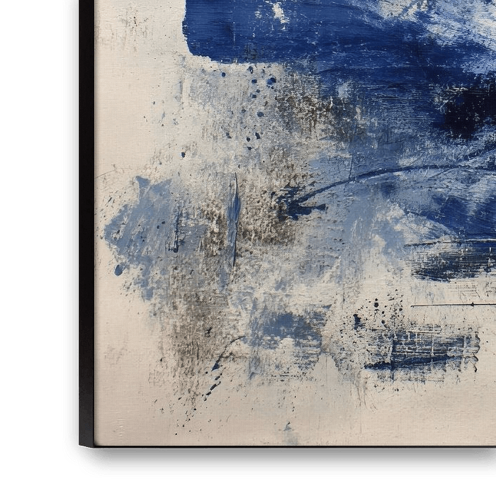 This blue abstract painting with broad brushstrokes, dynamic textures and playful paint splatters feels mysterious and expressive, adding a powerful feel to your interior. The mix of deep indigo, bright blue and soft haze textures brings a sense of movement and artistic depth. Nicely suited to Scandinavian, Japandi, Modern Chic and Wabi-Sabi interiors and a special addition for living room, office, bedroom and study.