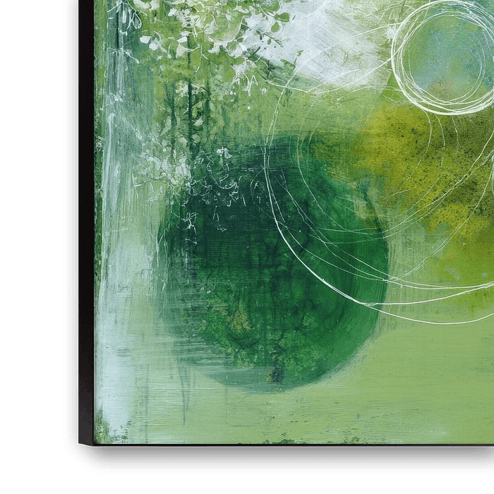 This green abstract painting with round shapes, soft colour gradients, white spheres and fine organic lines has a dreamy, modern feel and adds a natural calm to your interior. It brings a poetic, soft atmosphere with a touch of freshness. Fitting nicely into Japandi, Scandinavian, Country and Modern Chic interiors and a special addition for living room, dining room, bedroom and office.