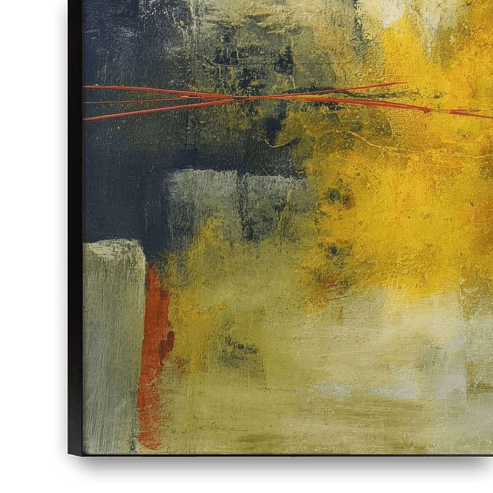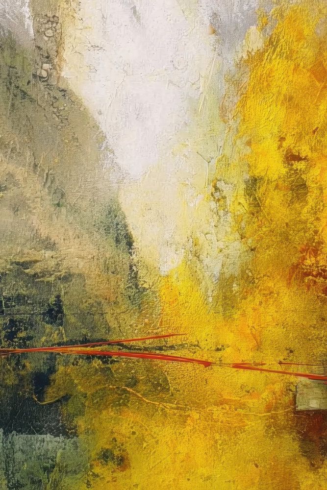 This abstract painting shows a dynamic composition of overlapping areas of colour in yellow, olive green, grey and warm reddish brown. Visible, textural paint texture, soft gradients and subtle scratches create depth and a vibrant surface, while thin red lines cut horizontally through the work and add tension. An expressive abstract…