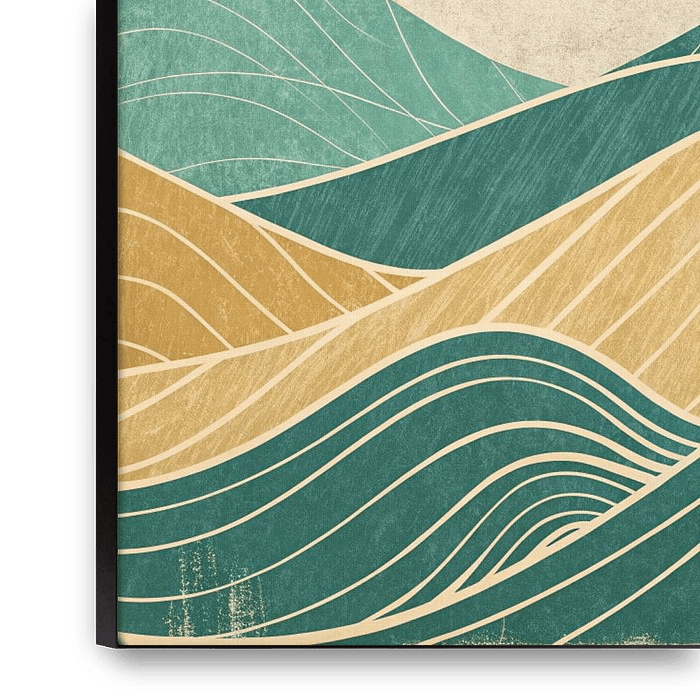 This textured abstract landscape captures a tranquil scene with a dominant, golden circle representing the sun, casting its glow over gracefully rolling hills and flowing waves. The color palette features earthy tones of deep teal and calming sandy yellows, suggesting a harmonious blend of land and sea under a warm, expansive sky. The…