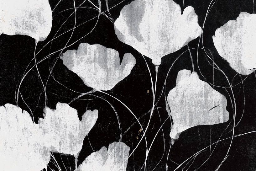 A collection of white, poppy-like silhouettes floating against a solid black void. Thin, energetic white lines loop through the composition like tangled stems or wind-blown silk.