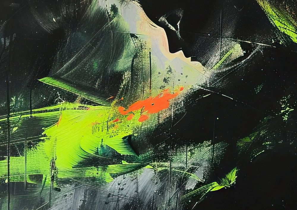 Abstract Women Painting | Silent Colour Burst - This abstract painting depicts a stylised, silhouetted portrait of a woman, subtly contained in a dynamic, explosive and emotional spectacle of colours and shapes. The dark contours of the female silhouette blend with intense dark backgrounds and are suddenly broken by bright neon accents of green and orange. The use of green is no mere detail; it splits the canvas with awesome energy and vitality, as if it represents a first spark of life or intuitive thought breaking through the darkness. This visual eruption is further complemented by small splashes and details in white, which seem to act as reflections of light or metaphors for new ideas and possibilities that are emerging. The overall composition, with its fluid movements and abrupt contrasts of colour and light, evokes feelings of both mystery and revelation, typical of modern abstract art.
