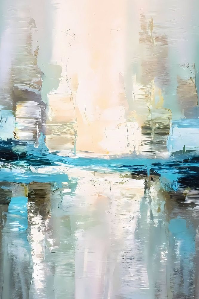 This design exudes a serene and calm atmosphere, perfect to complement a modern interior. The harmonious balance between the soft shades of blue, beige and white creates a calming feel. The abstract reflections create a sense of movement and depth, while the light accents give the composition a contemporary feel. Ideal for spaces where tranquillity and style come together, such as a bedroom, hallway or modern living room. A real eye-catcher that fits effortlessly into various interior styles.