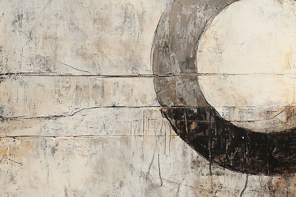 This intriguing abstract artwork combines subtle earth tones with powerful contrasts of black and white. The large circle in the centre draws immediate attention, while the rough, irregular lines give a sense of movement and depth to the design. The texture of the painting comes to life through the layers of paint that give the surface a tactile quality. Perfect for lovers of minimalist and modern interiors, this artwork would make a wonderful addition to a bedroom or office. The monochrome colours and abstract shapes make it versatile and timeless, suitable for giving any space an artsy and sophisticated look.