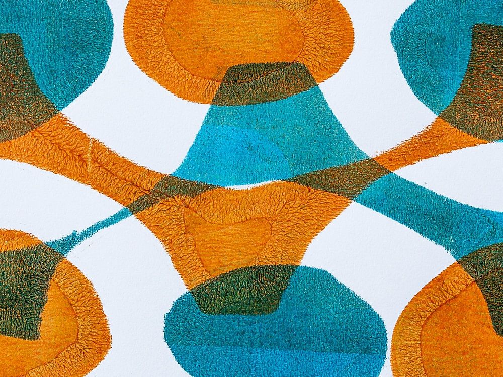 This monotype or monoprint is made with a geliplate and acrylic paint. A unique handmade and one-off piece, only 1 print can be made of your design. Because of the graphic printing technique and the paper used, all kinds of structures and effects are created. In the colors, the structures resemble an aerial photograph of a river delta. Here, layers are printed on top of each other, with homemade stencils in between. As a result, there seems to be a certain depth to the work. The round shapes interlock like links of a chain. The color is warm orange brown and turquoise and and greenish. Natural tones that fit into retro interiors and modern interiors. The colors and pattern are also reminiscent of the seventies. A unique handmade piece of art.