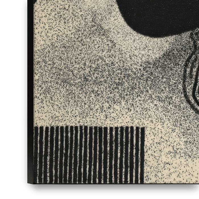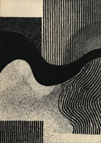 A dynamic composition of black and white that captivates with contrasts between solid shapes, straight lines, curved elements and stamp-like textures. The design combines vertical stripe patterns with organically flowing curves and grainy surfaces, creating an exciting visual tension. An abstract pattern reminiscent of graphic art and…
