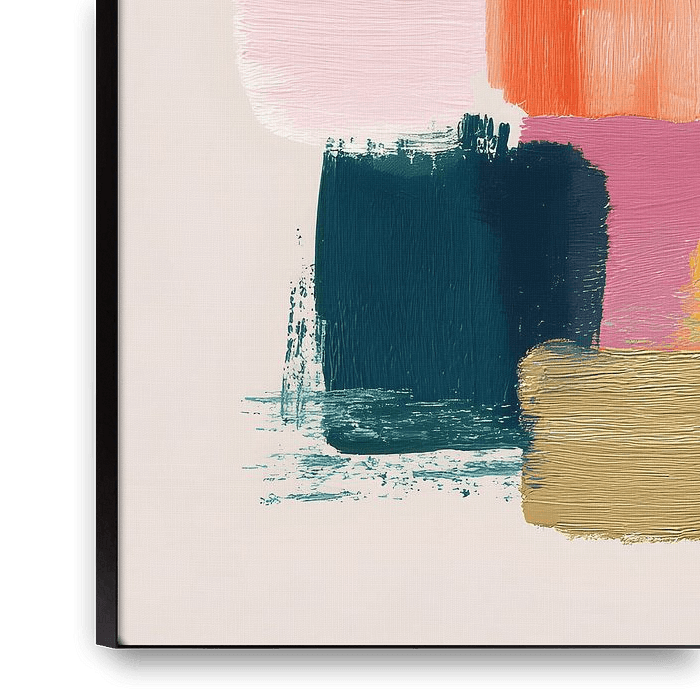 A modern abstract painting with layered block shapes in pink, coral, teal, soft yellow and cream. The fresh colours and playful composition create a cheerful and energetic look, while the soft background keeps the whole piece in balance. Perfect as a colourful accent in a light and modern interior.