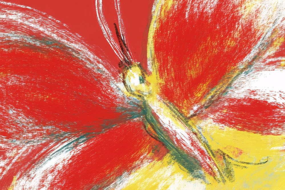 This colourful design brings to life an abstract butterfly on a dynamic red background. With energetic brushstrokes in red, yellow and white, it exudes a vibrant and modern feel. Perfect for spaces where a striking piece of art is allowed to set the mood, such as a bedroom or dining room. This design captures the beauty of a butterfly in a bold, expressive style, making it an excellent choice for lovers of abstract art and bright colours. Add a touch of dynamism to your interior!