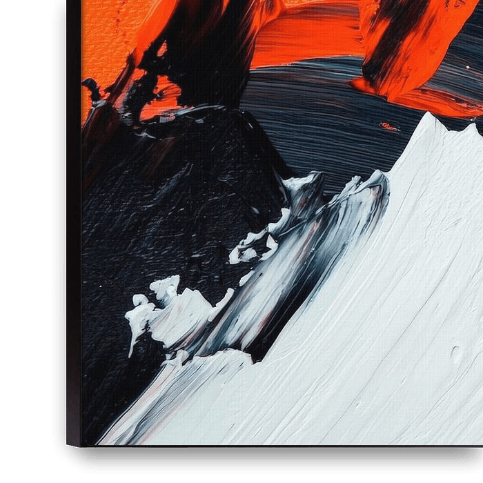 With powerful oranges and deep black and white tones, a dynamic interplay of energy and contrast unfolds. The vibrant brushstrokes convey a sense of movement and passion. This modern composition is perfect for a creative living room or an inspiring office and will attract everyone's attention.