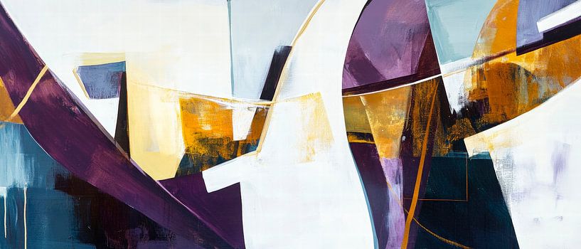 A fascinating interplay of deep violet and luminous gold unfolds, while abstract shapes dance powerfully together. This dynamic composition brings energy and elegance to any room. It is particularly eye-catching in the living room, stimulating conversation and creating a creative atmosphere.