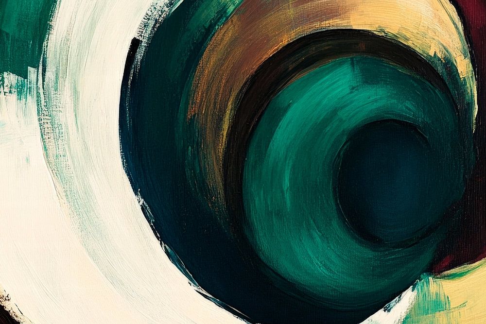A harmonious interplay of vibrant green tones and soft earthy colours creates a dynamic movement that attracts the viewer. The curved shapes are both calming and inviting. This work of art finds its ideal place in the living room, where it can encourage inspiring conversations and creative thoughts.