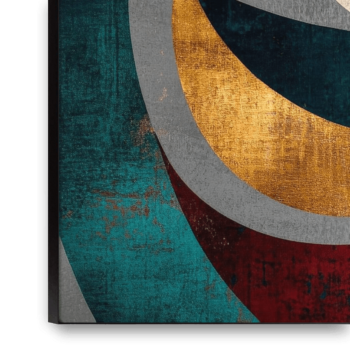 A harmonious interplay of curved lines in vibrant colours unfolds before the viewer. The combination of rich red, deep gold and calming turquoise creates a dynamic atmosphere. Ideal for a modern living room, this work of art adds a creative accent to any room and invites you to linger.