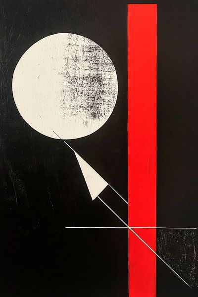 A powerful interplay of geometric shapes and contrasts unfolds here: A radiant white sphere, which looks like a shining moon, meets a bold red stripe, while delicate lines round off the composition. This creative scene adds a dynamic touch to a modern living room and encourages reflection.