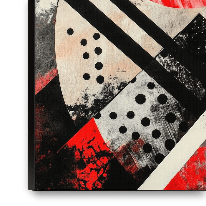 Dynamic shapes combine to create a powerful interplay of red, black and white. The bright red circle immediately catches the eye, while the graphic lines and dots create harmonious tension. Perfect for a modern living room, it adds a touch of creativity and energy to the room.