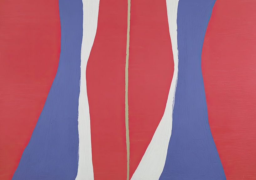 Abstract painting with soft, curved shapes, dominated by bright red, contrasted by violet blue and light white accents. A fine vertical line in the centre divides the composition and emphasises the symmetry. The work plays with areas of colour and organic contours. A minimalist expression of American Abstract Expressionism.