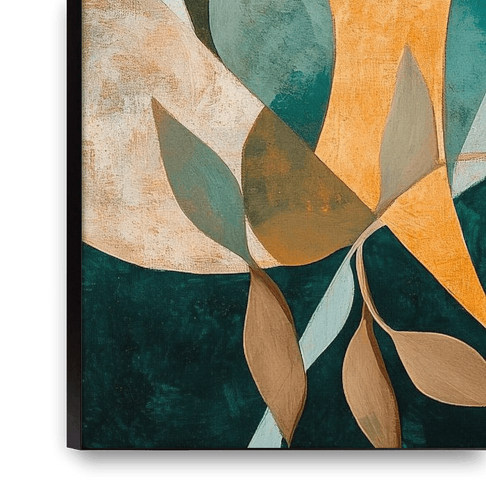 Soft earthy colours and cool green tones blend harmoniously in this abstract work of art, which is reminiscent of the natural forms of flora. The gentle curves and geometric elements lend a modern elegance that fits perfectly in a living room or a creative corner of an office. A real eye-catcher that radiates calm and inspiration.