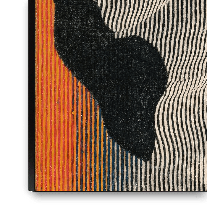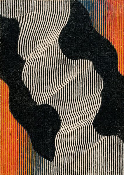 This asymmetrical composition focuses on the stark contrast between organic and geometric structures. At its centre is an amorphous black shape, which is given a dynamic depth effect by flowing white wavy lines. This central element is flanked by precise vertical stripe patterns in orange and blue, as well as fine line structures. The…