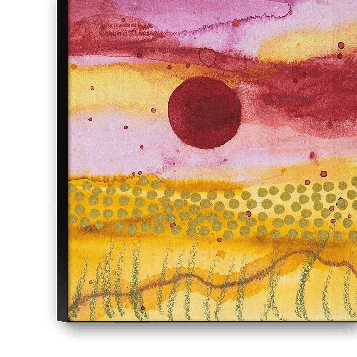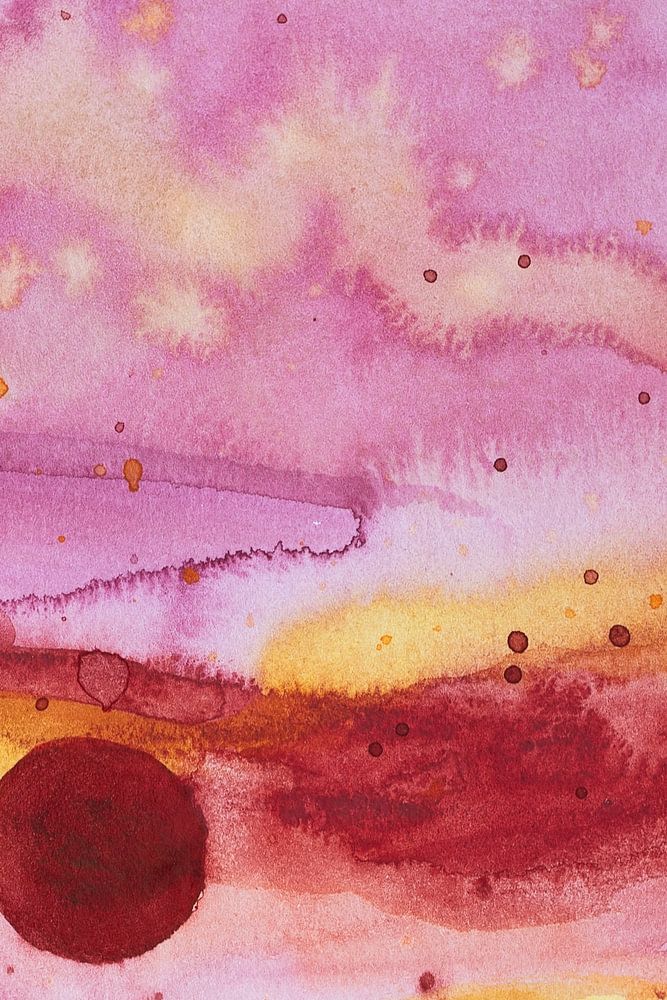 The sky is richly hued with nuances of pink, dark red and ochre yellow. The watercolour paint was applied loosely and with plenty of water, making the colours flow smoothly into each other and creating a dreamy effect.