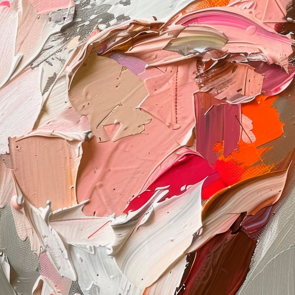 The painting presents an abstract portrait study, characterised by lively brushstrokes and a dynamic colour palette. The strong tones of pink, orange and beige emphasise the emotional facets of the face, while the grey background creates a deep, almost dream-like atmosphere. This composition plays with the perception of identity and expression.