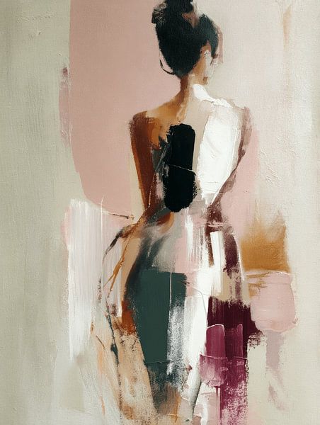 A modern, abstract female figure from behind, painted in soft blush and cream tones with powerful accents in deep green, aubergine and black. The layered paint strokes and rough texture give the work a tactile, almost studio-like character. The silhouette is elegant and understated, as if catching a moment of silence just before someone…