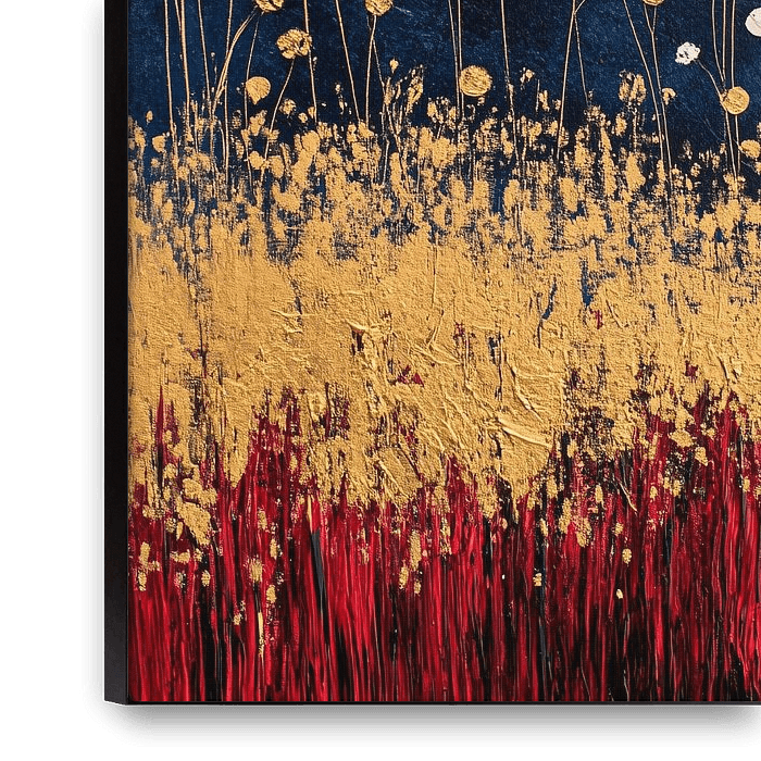 This unique painting combines the warm tones of red and gold with soft white floral details against a dark background. The design exudes luxury and energy, perfect for a modern interior. The abstract style makes it versatile and suitable for different rooms, such as a bedroom or dining room. This artwork instantly grabs attention and…