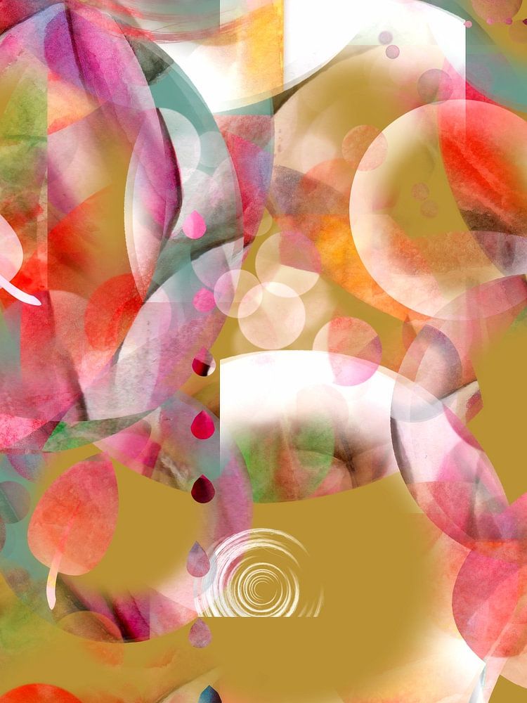 Digtial Art Collage of Abstract shapes. Circles and shapes in various colours on a cream/beige coloured background. In the colours pink, red, white, green, blue and yellow. Beautiful as a painting in the living room or bedroom