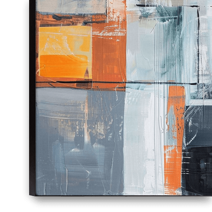 This beautiful abstract painting combines a dynamic interplay of shapes and colours. The artistic composition consists of a mix of rectangles and squares in various shades of orange, grey, blue, white and beige. The clean lines and playful textures create a modern look, perfect for any contemporary space. Hang this artwork in your…