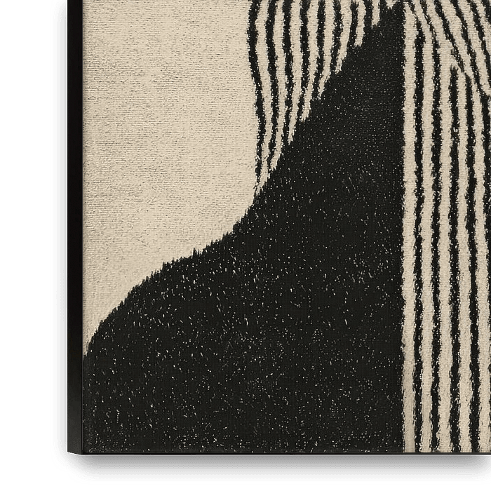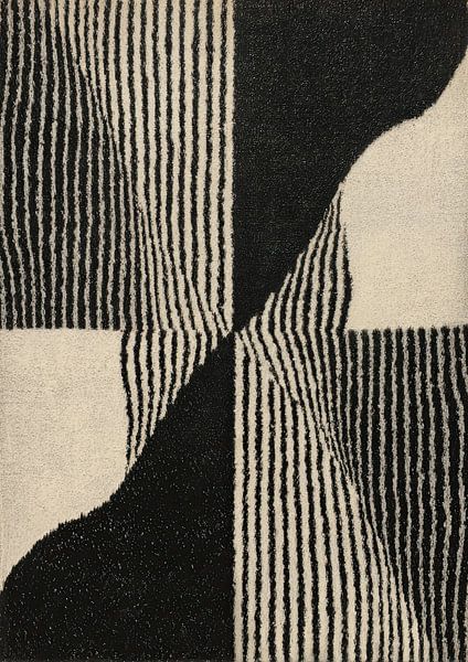 This abstract design is characterised by a powerful interplay of black and white surfaces. Vertical stripe patterns meet organically curved shapes, creating a dynamic depth effect. The fine, grainy texture gives the work a tactile quality reminiscent of textile surfaces. The deliberate distortion of the lines creates an optical effect…