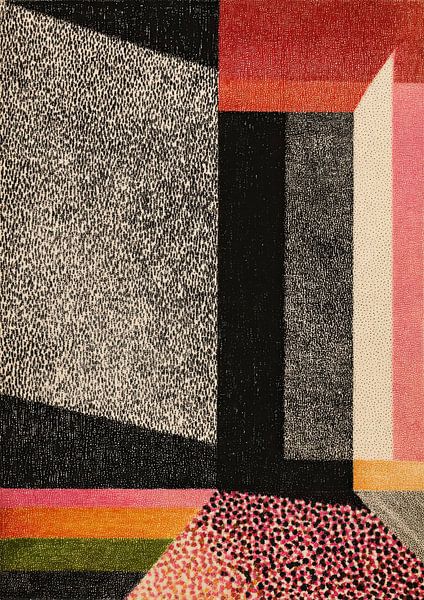 This artwork presents an abstract composition of geometric shapes. The technique is based on fine pointillism, which gives the colours depth and a grainy texture. Black, grey and red areas contrast with accents in pink, orange and green. Vertical and diagonal lines divide the image into dynamic segments. The focus is on the interplay…