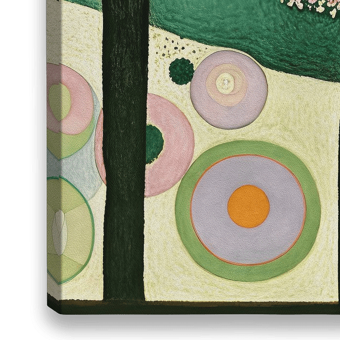An abstract landscape with strange fanciful trees, some looking more like large flowers. In the distance, a pink house seems to stand. This landscape invites the viewer to explore the boundaries of reality, where nature takes an abstract and surrealist turn.