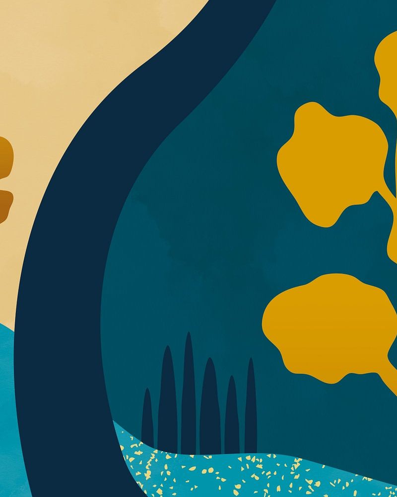 Abstract illustration of a landscape by day and by night: a tree bathed in sunlight on the left, and a tree under the full moon on the right. The golden yellow light creates glittering reflections on both sides and forms a great contrast to the different shades of blue.