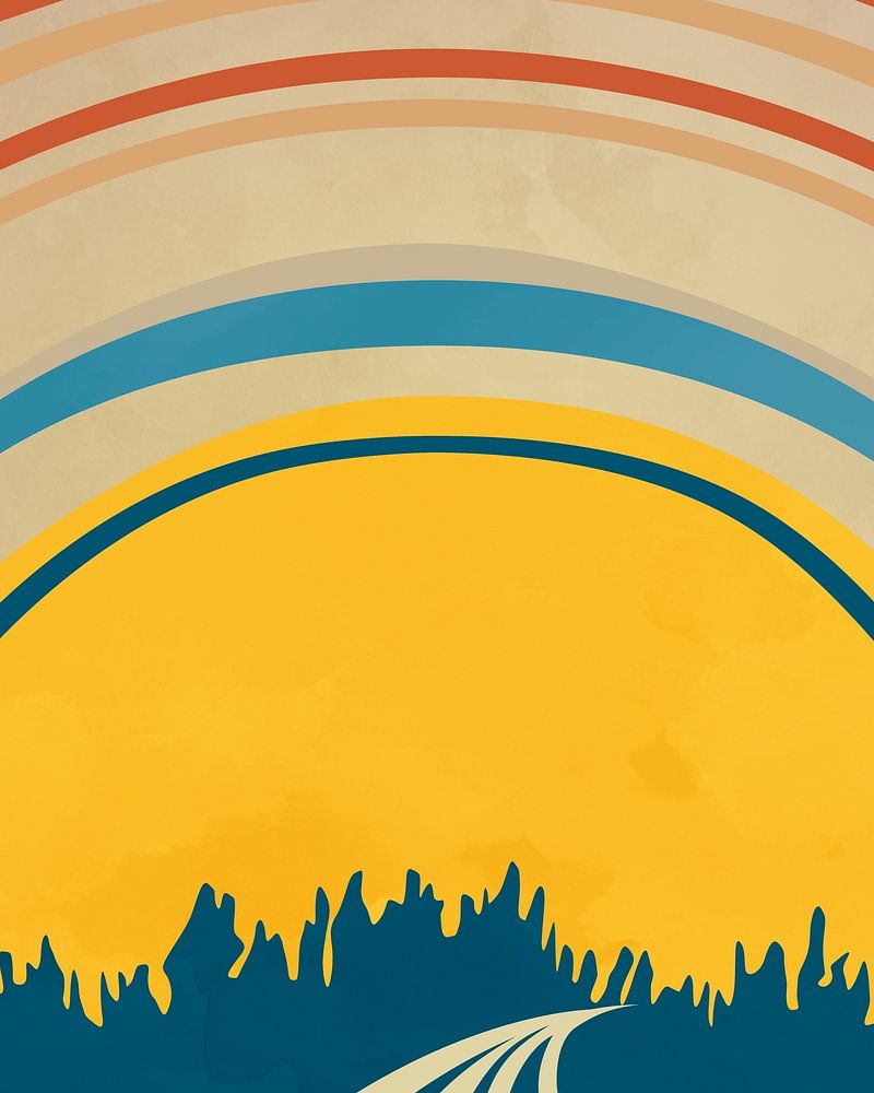 Abstract landscape with a road leading through a meadow into the sunset. The retro design and colors - blue, red, orange, yellow, beige - are inspired by the 1960s and 1970s.