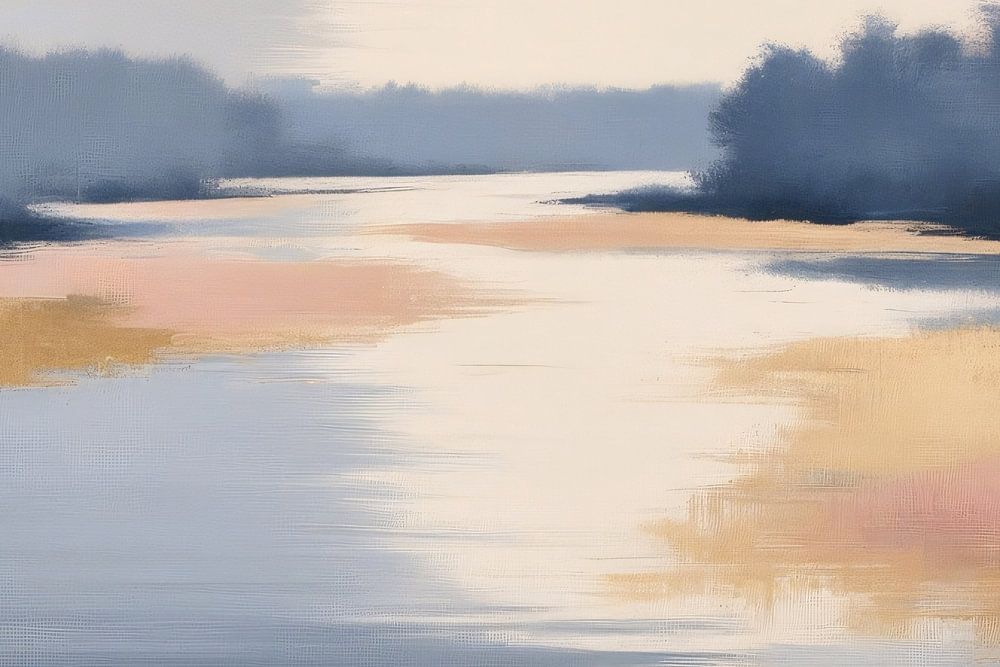 This design exudes calm and serenity with its soft colours and abstract approach to a river landscape. The interplay of blue, gold and pink with subtle reflections makes this painting perfect for modern decor. It is an ideal addition to a living room or dining room, adding a sense of space and calm. The abstract elements ensure it blends seamlessly with different interior styles, while remaining a striking artistic accent. Suitable for lovers of minimalist and modern art.