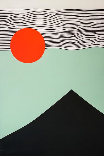 A powerful sunrise meets rolling hills, while dynamic lines bring the sky to life. The bright red of the sun radiates energy, while the calm, mint green and black tones create a harmonious balance. Ideal for the living room to inspire conversation and create a creative atmosphere.