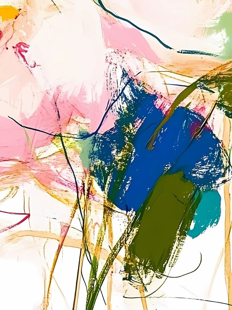 A vibrant abstract floral composition bursts with soft pastels and bold expressive strokes, creating a fresh and modern feel.