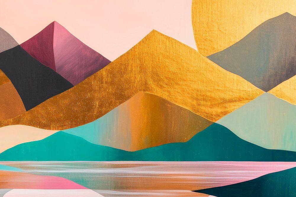 A harmonious interplay of soft colours and golden accents brings the landscape to life. The stylised mountains are reflected in the calm water, while the radiant sunrise creates a warm atmosphere. This artwork adds a touch of calm and inspiration to any living room, perfect for relaxing evenings and socialising.