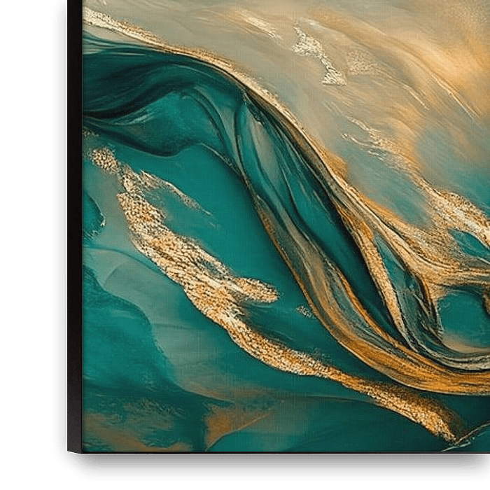 A mystical dance of soft, shimmering colours envelops an elegant figure as if it were gliding weightlessly through a dreamlike landscape. The harmonious combination of gold and teal lends the room a calming atmosphere. Perfect for the bedroom, this work of art creates an oasis of relaxation and inspiration.